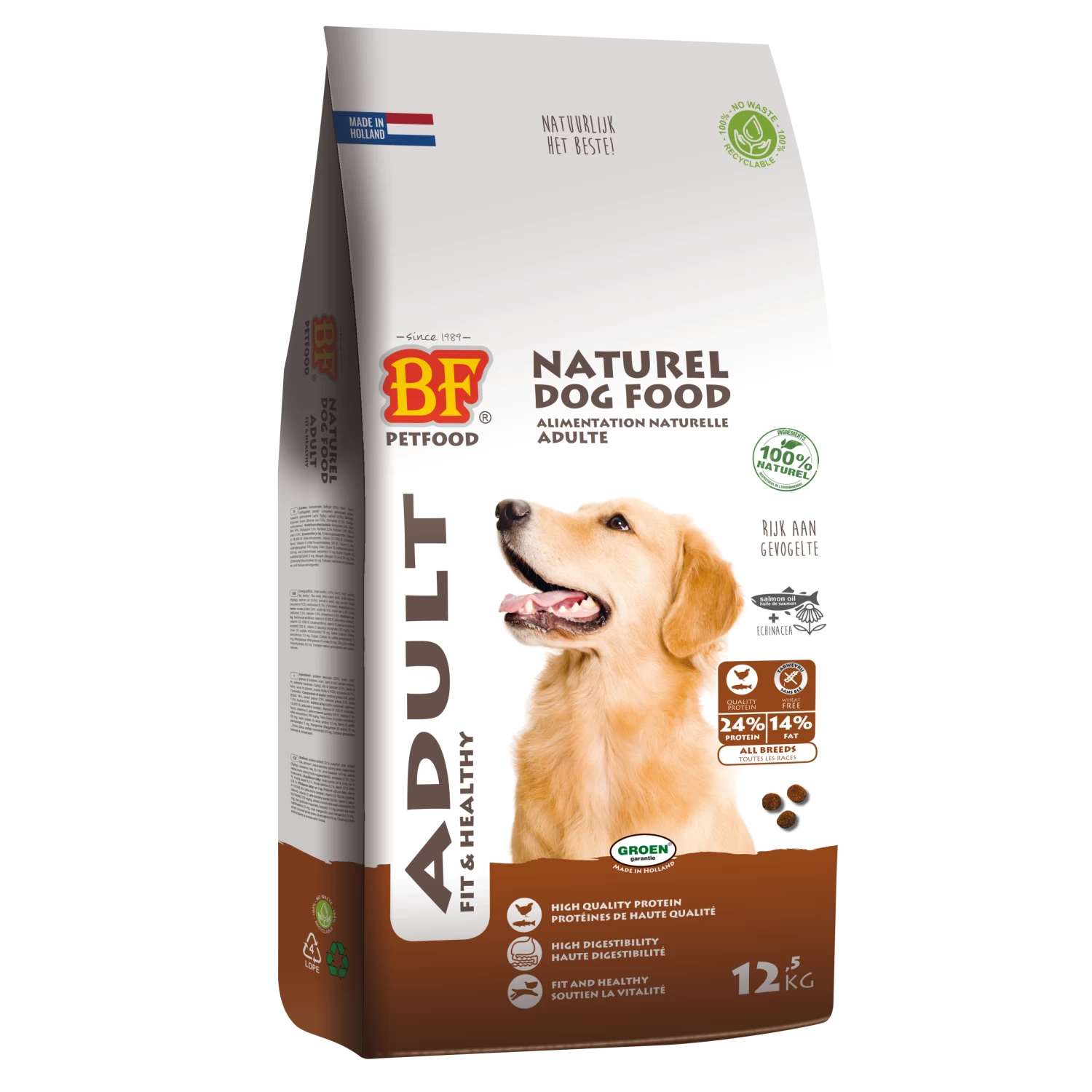 BF Petfood® Adult Krokant. Nederlandse topkwaliteit. Hoogwaardige premium grondstoffen. Volledige licht verteerbare geëxtrudeerde hondenvoeding voor volwassen honden. Met gevogelte en zalm. Tarwevrij. Hoge acceptatie en verteerbaarheid. Optimale voeding die zorgt voor een betere vertering, ontlasting en een goede conditie van uw hond. Zonder chemische toevoegingen. Voor volwassen honden.