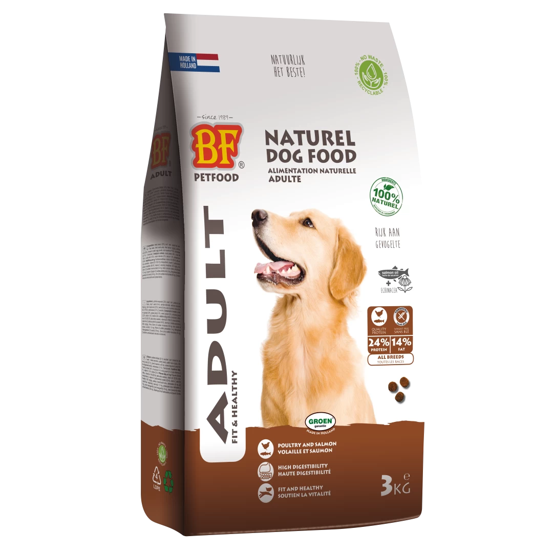 BF Petfood® Adult Krokant. Nederlandse topkwaliteit. Hoogwaardige premium grondstoffen. Volledige licht verteerbare geëxtrudeerde hondenvoeding voor volwassen honden. Met gevogelte en zalm. Tarwevrij. Hoge acceptatie en verteerbaarheid. Optimale voeding die zorgt voor een betere vertering, ontlasting en een goede conditie van uw hond. Zonder chemische toevoegingen. Voor volwassen honden.