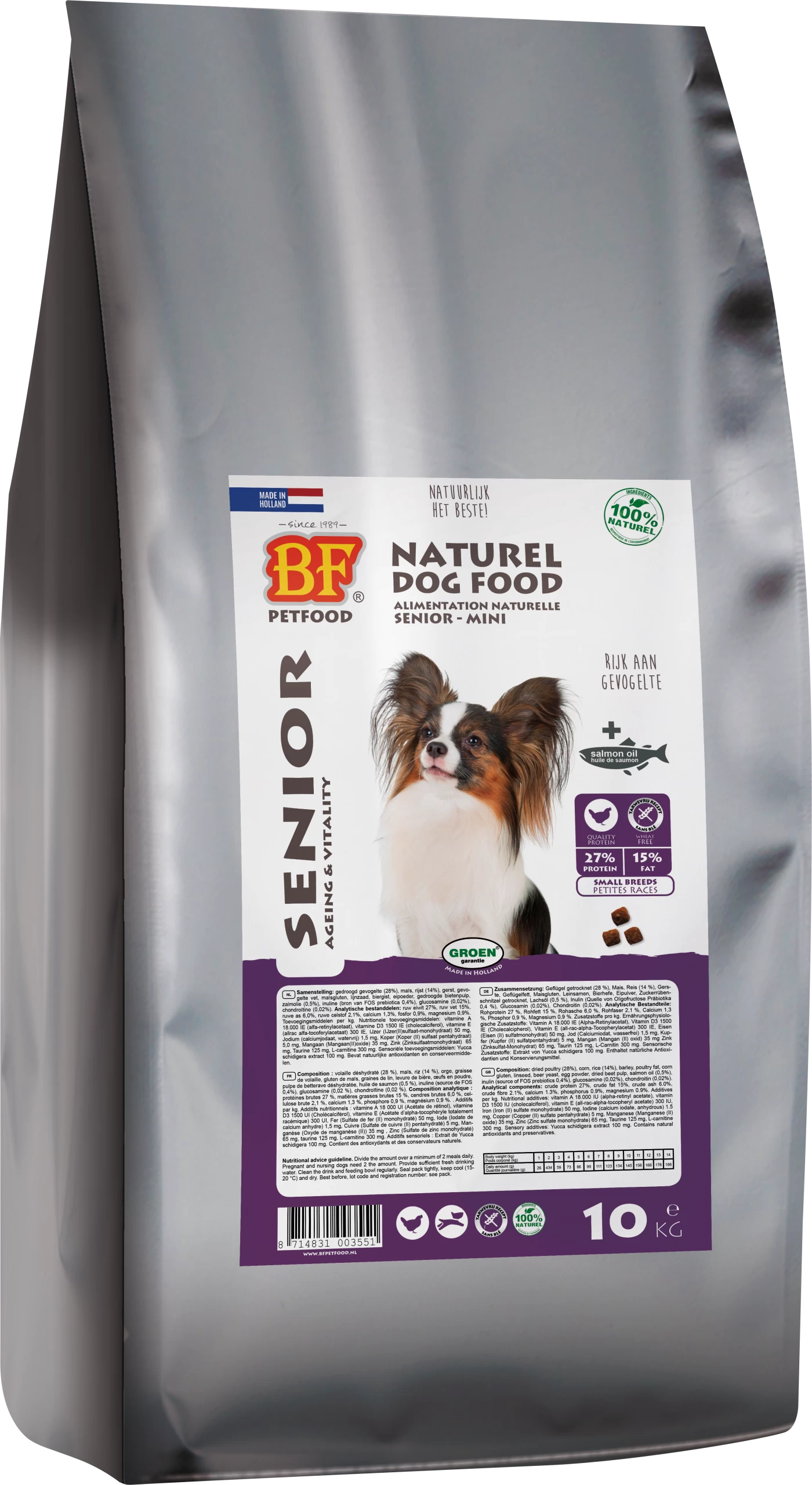 BF Petfood® senior mini is een hoogwaardige volledige natuurlijke smaakvolle hondenvoeding voor oudere honden van kleine rassen. Rijk aan gevogelte en rijst. Met zalmolie, chondroïtine en glucosamine. Tarwevrij formule. Hoge acceptatie en verteerbaarheid. Optimale brokgrootte, -vorm en -structuur. Ondersteunt veroudering, vertering, mobiliteit, gewicht en huid en vacht. Inuline FOS (prebiotica) stimuleert de darmflora en ondersteunt hiermee de gezondheid. Met vitamine E en C, die bescherming kunnen bieden tegen celveroudering. Beperkt geur en volume van de ontlasting. Gezonde voeding die zorgt voor een optimale vertering, ontlasting en een goede conditie van uw hond.