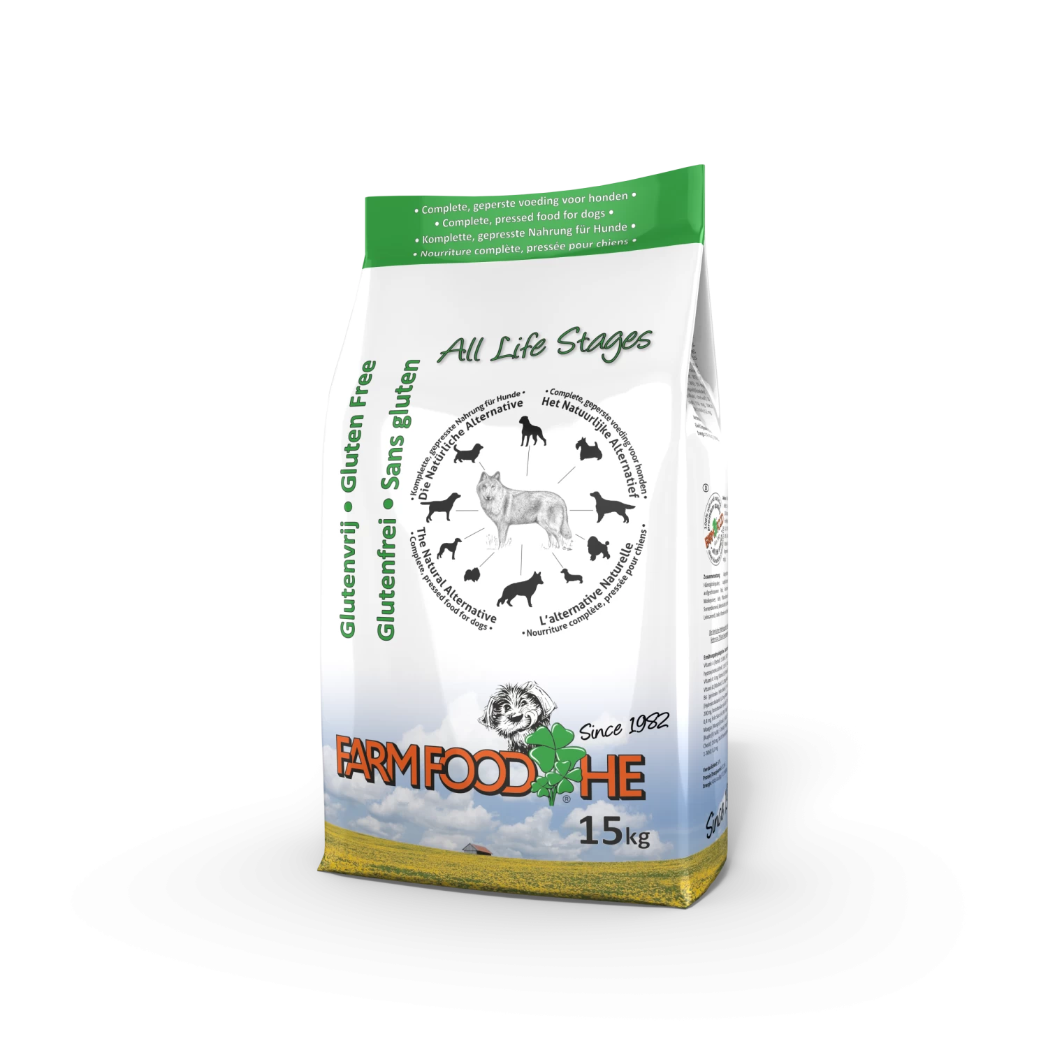 De samenstelling van Farm Food HE “Glutenvrij” is in de basis gelijk aan Farm Food HE “Classic” en Farm Food HE “Schotse Zalmolie”. Het grote verschil is echter dat de tarwe is vervangen door Sorghum en rijst (beide zijn gepoft, daardoor voorgekookt).